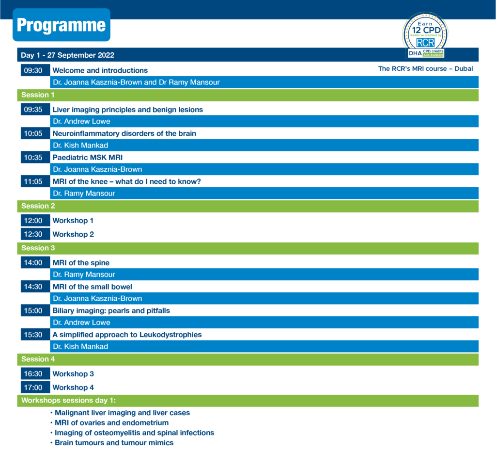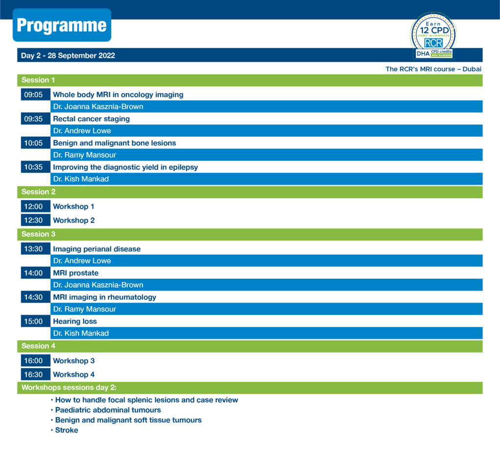 CPD: This program is awarded 11.5 CPD credit points by the Dubai Health Authority and 12 RCR CPD credits
